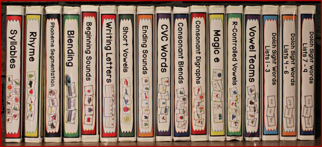 A few years ago my daughter and Lizzie and I were checking out the donated movies at our local Habitat for Humanity store and it just hit me! Those old VHS cases would be perfect storage for teaching activities! They would store so nicely on shelves and you’d just be able to pick the skill you’d like to address, grab the case and all the materials you need will be right there! Shortly after our little trip I started creating the activities for the VHS cases. I started with rhyme and ended with vowel teams.  There are a total of 17 different Activities on the Go! phonemic and phonics-based activities.