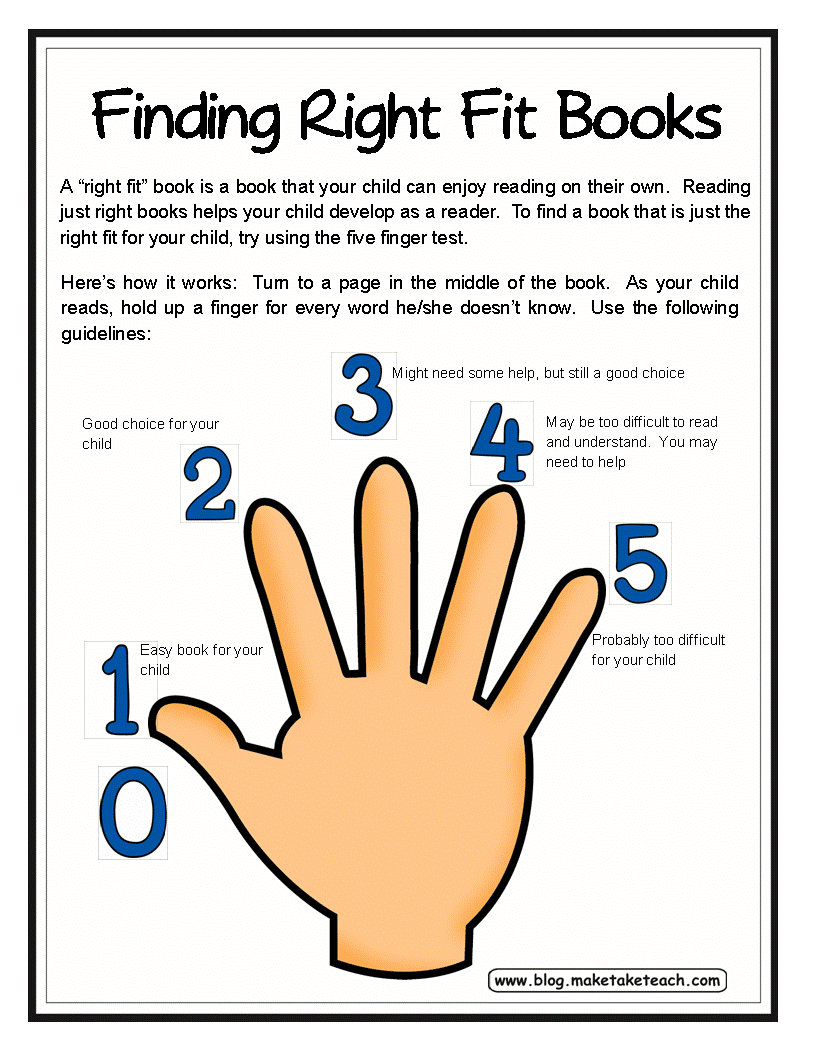1. Visit your local library! Help your child find “right fit books. Right fit books are books that are of high interest to your child and are not beyond their reading level. You can use the five finger test to determine if the book is too difficult for your child. Open the book to a page with many words. Have your child begin reading the text. Hold up a finger for each word he/she does not know. If you have 4 or 5 fingers up, the text may be too difficult for your child to read independently. Feel free to still check out the book! It just may be a book you want to read with your child.