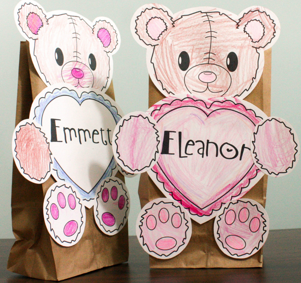 Kyle (fabulous artist) created these cute little bear and rabbit for decorating Valentine’s Day bags for collecting cards. Aren’t they just adorable? Your students will have tons of fun creating their very own collection bags. Simply copy the bear or rabbit for each child and have them color and glue the pieces on a paper bag. Super simple!