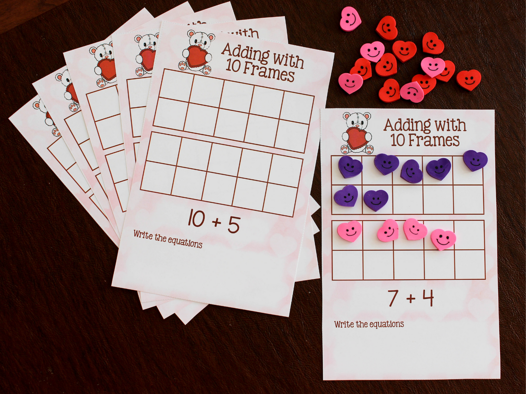 Your students will just love learning addition facts to 20 with this ten frame addition activity. Once laminated, the ten frame addition facts templates will last for years. Although any manipulative will work, fun Valentine themed mini erasers (can be found at a local dollar store) add a little twist to the activity. Students simply place the two different types of erasers (or manipulatives) in each 10 frame matching the numbers within the addition problem. They then move the erasers of the one set to complete the 10 frame and then writes the addition problems using a dry erase marker. This activity supports the strategy of making 10 to solve addition problems.